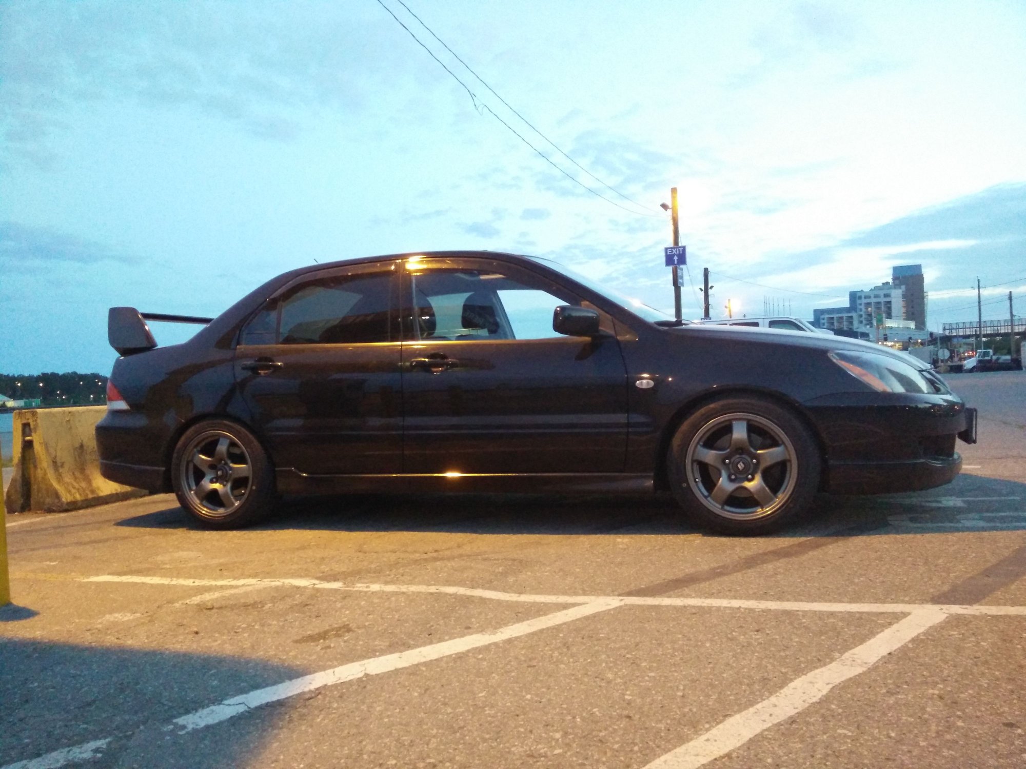 Just FYI, these 16x8 and weigh around 15.6 pounds per rim. 5x114.3 but centre bore is 66.1mm. Our Ralliarts have a 67.1mm hub. The front hub is smaller than 66.1mm so it is possible to fit them on, but the rears do not fit. I haven't tested whether it rubs in the front since OEM Mitsubishi lug nuts do not fit with these rims. I think I am using stock suspension settings.