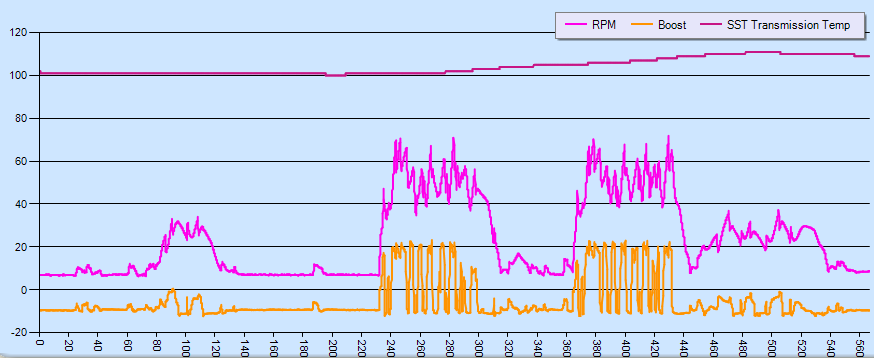 As far as my logs show, 120 seconds of hard track driving raises the SST temp by 5C.
