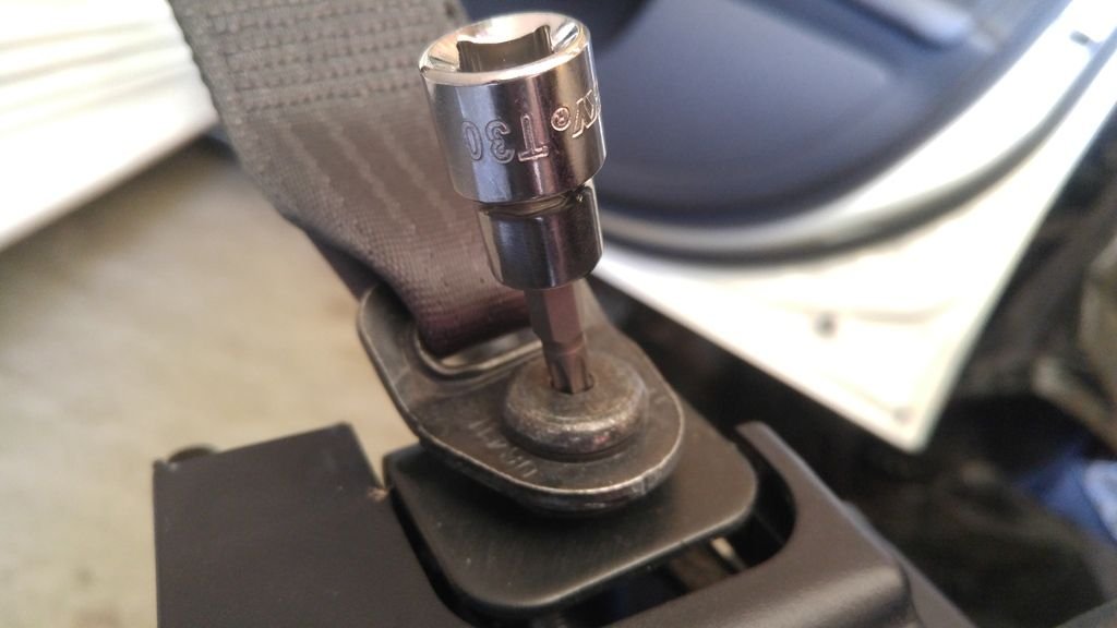 3. pulled out seat but still tethered to passenger side seat-belt lower mount. used T30 torque to disconnect this. and lay seat on it's side.