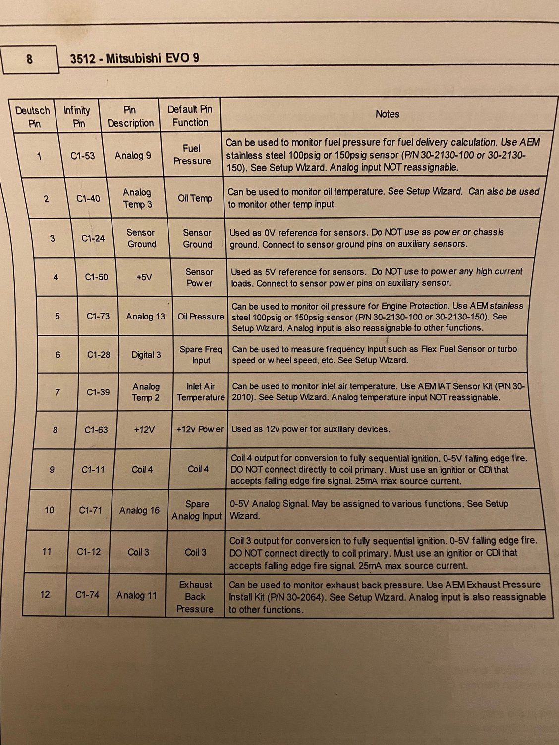 my question is for the boost gauge sensor (AEM 5 bar), I wold assume I power into sensor power pin 8? 12V+ Or pin 4 5v+? but what if in the future I need more inputs? Do I use the thicker 16 AWG wire to the pin, and splice in each additional sensors power to the one pin? And same with sensor ground? ( not gauge power or chassis ground, but sensor power and ground)