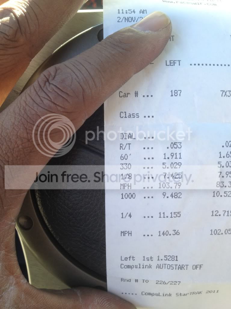 I took the beast out las weekend to see if I could better my 10.6@138. I was having traction issues and we had cross winds gusting over 16 knots. I ran the 10.6 during a night event at low 70 temps and this past weekend was mid 80s not to mention our track is around 2700ft above sea level. With all that against me I still managed a stout 11.1@140(spun thru 2nd gear). I will be back out soon with 2150inj, FIC fuel rail, race intake manifold and 70mm throttle body.