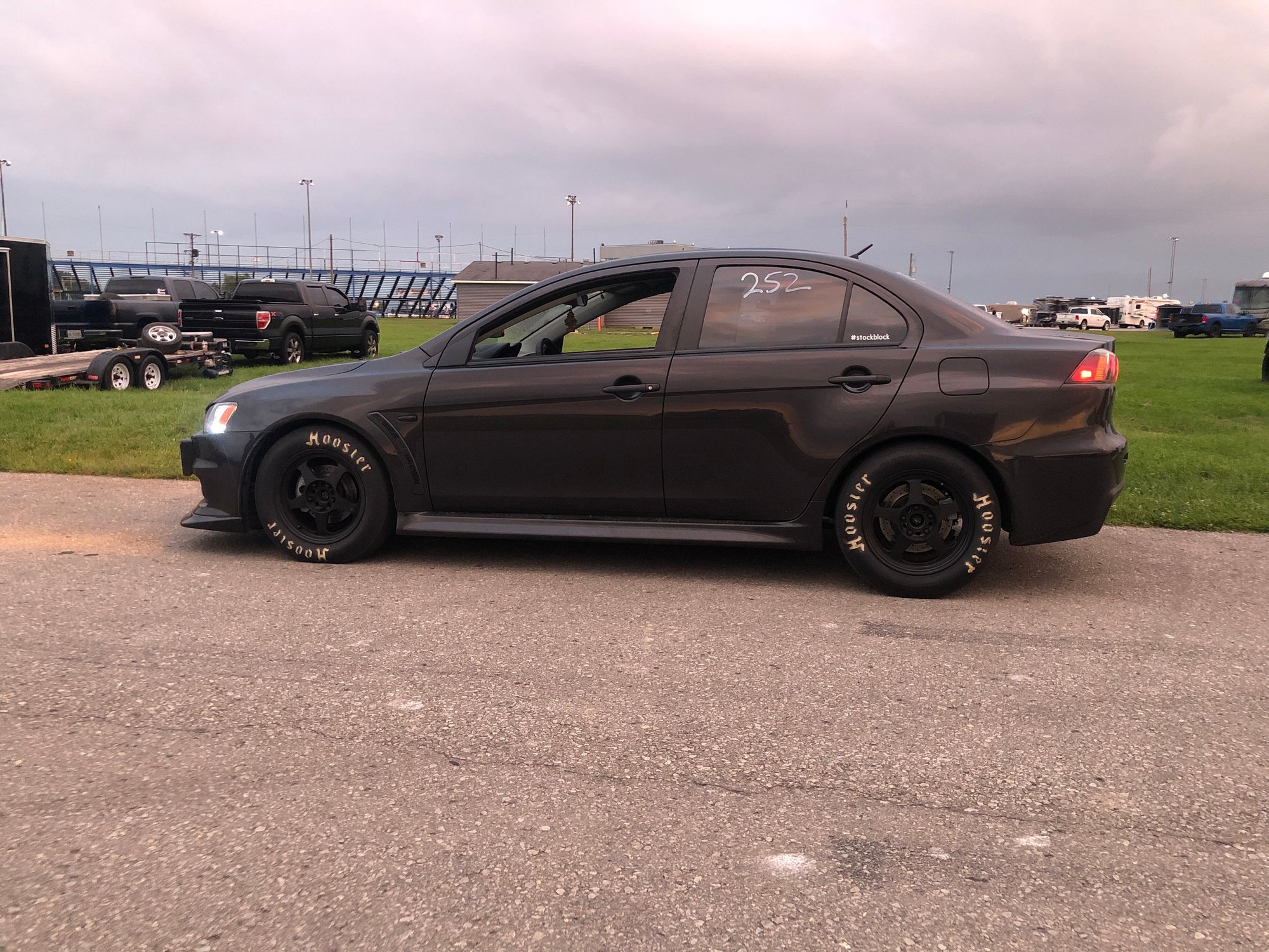 Car traps 126mph, so it makes some power for a stock 4B11. Weighs roughly 3350-3400 with me in it. It's on a T4 6266. Stock X 5 speed trans (stock final drive) with the shep diff pins, and repacked Evo 8 rear diff / Ralliart CV shafts. For a clutch, It's an ACT 6 puck, Evo 8 clutch master & clutch pill removed. The car is on Hoosier QTP's, 26x9.5x16. Launch control is set to 5750rpm.