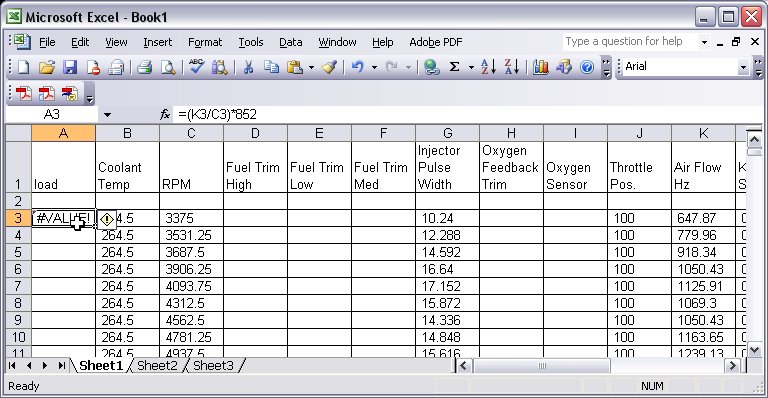 howevr lets say the rpm data is in colunm a and maf hz is in column c I write"=(c2/a2)*852" and it gives me a value error. it will not perform the c2/a2 part of the equation.