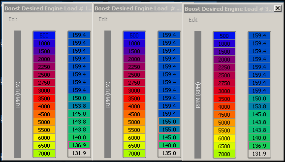 2. Set ALL three boost desired engine load tables to 150 provided the boost control offset is 100. This will give a target load of 250