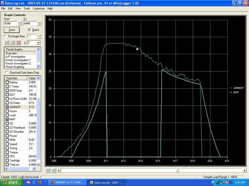 I can't log over 25psi on the zt-2 map sensor in mitsulogger until MJ releases the next version. Peak boost was 31.7 according to the peak hold function of the zt.2. I max'd the jdm sensor out at 33psi. The curves are a little closer and I personally think the discrepancy is due to sensor placement.