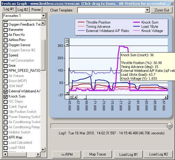 You can see 1st and 2nd gear, where there was more throttle, more load (and more RPM), and the same fuel, with a count or two of knock and a slight amount of off-throttle knock coming out of 2nd.