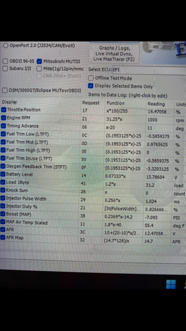Snapshot showing my settled LTFT for low and mid. Injector scaling is higher then I have seen. 2089. I like this though because it more matches what the injector actually is. These are tweaked values that are taken from what the guys at FIC have me for these injectors. This is what my minimum ipw is set to. I don’t even know if this is something that is working in my car or not. Iv never adjusted this value. This is the value that was previously in the tune. The lowest ipw my logger is seeing is 1.024ms so idk. Maybe someone can chyme in on this. .