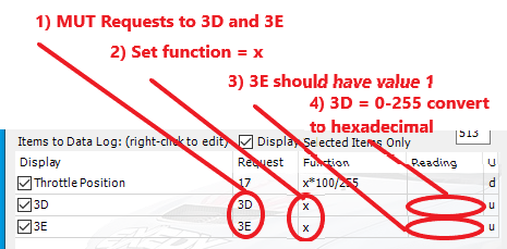 6) Wait for the clicking sound to stop. Read out the raw (set evoscan function = x) immobilizer value using evoscan or other MUT reader at 3D and 3E. It may also be possible to count the number of clicks from the engine bay and use it as the MUT 3D value. This value will likely be in decimal. Convert it to hexadecimal. For example, if evoscan shows 3D = 109 and 3E = 1 the hexadecimal equivalent is 0x6D01. If 3E does not have the value 1 then either you changed it in the patched ROM or something went wrong. It's suggested you try 1 and not other values for this byte.