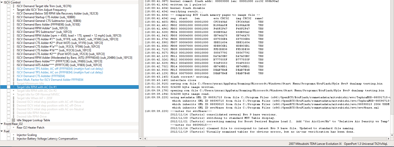 so im having this issue with ecu flash im trying to read the rom on my new evo 9. i got the tephra xml loaded up and everything is the most recent version of it i could find. its running on ROM ID 88591715 SD. the issue im having is i cant find any good tables for startup fuel decay. it cold starts wellish but idles kind of high which i think i have that figured out with the ISCV tables that are available and not greyed out. The real problem is warm start is super lean and wants to die for about 30 seconds then it just goes away and runs normally. Another problem is im not finding this rom to have very many good fuel tables for idle. i also have a ton of greyed out options all over the place specifically my SD MAP sensor VE and Calibration table is greyed out. i have not edited any xml but i know how if i need to, other problem is searches are leaving me short of information for this rom. i can post up my rom when i get to my laptop and its using the tephra v7 xml package. Any sort of help would be appreciated