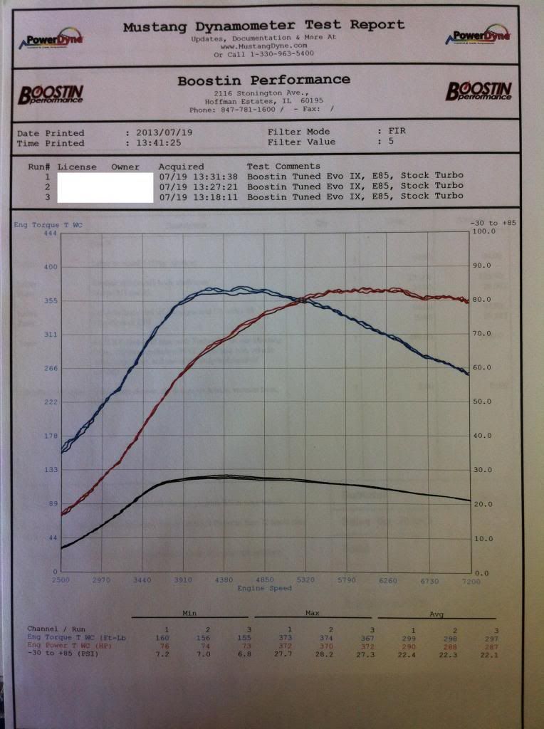) started to do boost leak test and vehicle inspection. They found boost leak on my throttle body and recommended me to put new seal in. The mechanic was super nice and took care of my car as his own car. After done with diagnoses, Devin started to tune the car. I think tuning took about 1hr and 30 mins. During that time, Devin informed me how the tune was progressing after each pulls. Also, he explained dynograph and told me what he was going to try after. This was the best aspect of Devin I think. He was just not tuning the car, but he was also taking care of the car. The car made 370whp/395wtq at max boost ~31psi on E85 at the first place, and he asked me he would like to de-tune the car a bit b/c those numbers were kinda risky with stock block. So, in the end we ended up with ~370whp/~370wtq and max boost at 28psi