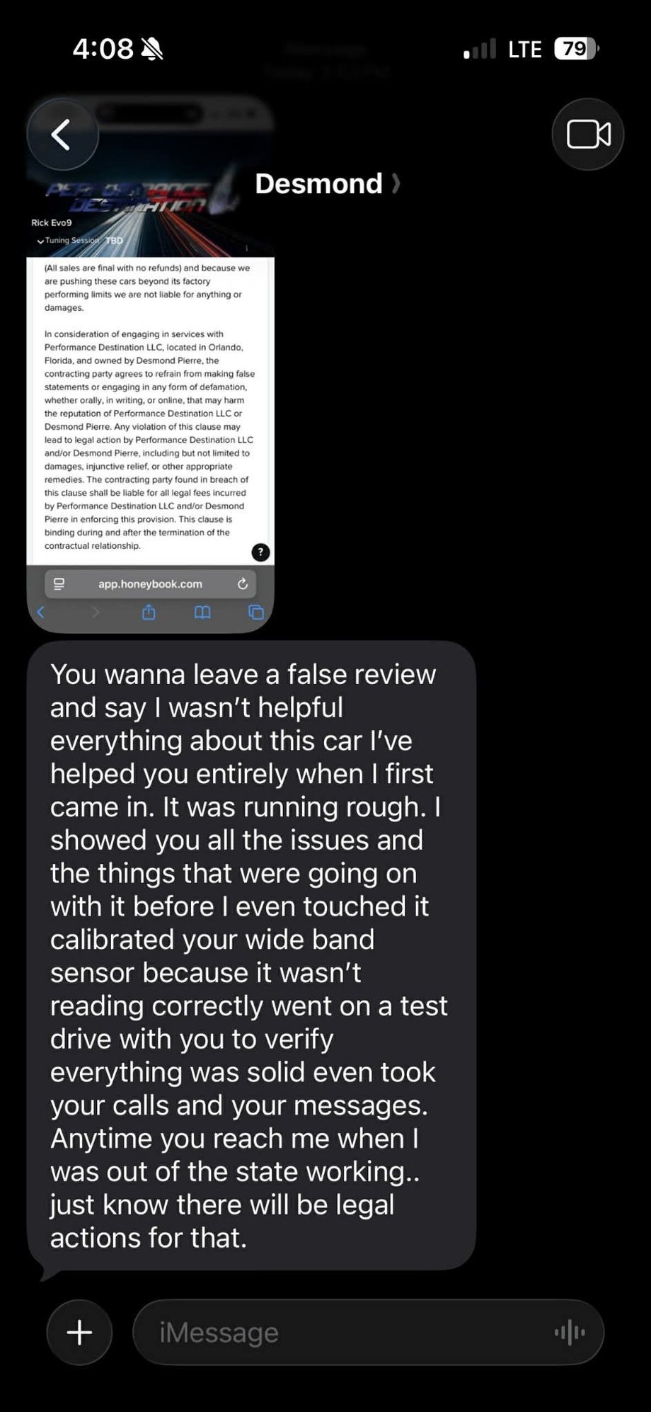 Quick follow-up, Desmond just sent me a text threatening legal action for posting my honest experience and review. Screenshot attached. Truly fantastic customer service that you can expect by choosing "performance destination".