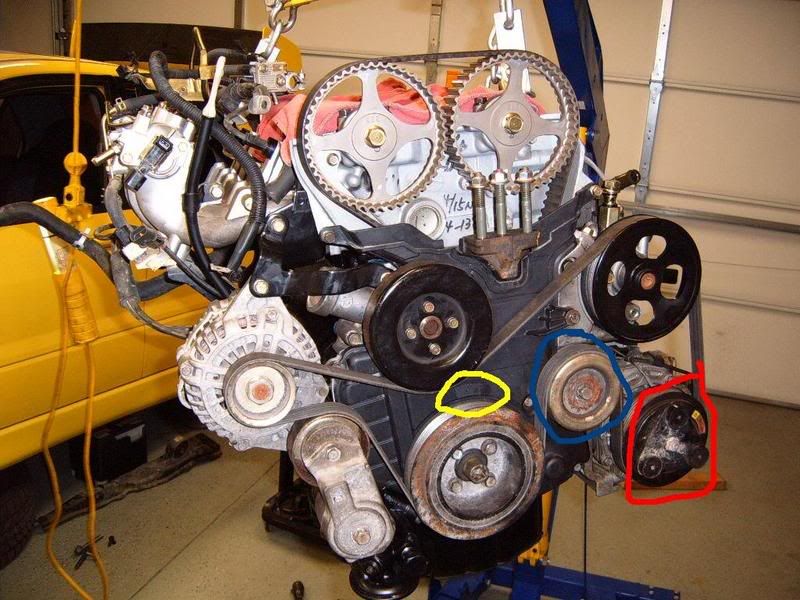 The bolts that hold the pulleys to the cams are tight as hell as well. Make sure you wrap something (ie. a towel) around the cam to hold it down when you break these bolts off.
