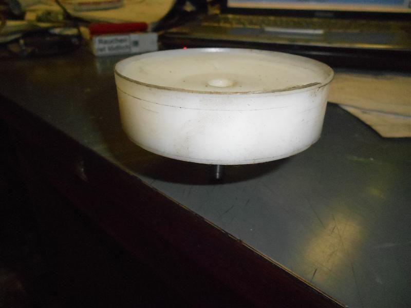 Picture of the first version, "Delrin" material later changed to Teflon for better seal to the walls and with o-ring. Hone plug