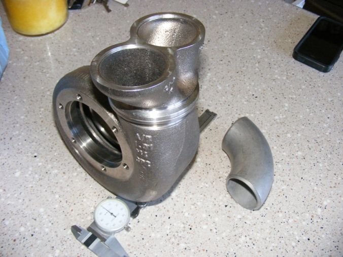 I understand the concept of staggering the exhaust pulses, but I do not agree with your statement that cross sectional area doesn't change. You are assuming the twinscroll begins at the vband, when it actually begins 1.5" upstream at the cast merge collector, which is actually part of the twinscroll turbine housing. Also, you assume the exhaust pulses are perfectly staggered and there is absolutely no overlap upon entering the merge collector, which is potentially a big assumption. If we assume the twinscroll begins at the vband and you used piping with an equivalent ID to 1.5" sched 40 weld els (1.625"), you can see how much larger the runner is overlay onto the opening of the vband twinscroll turbine housing in the first pic below. If we overlay the pipe on the cast vband merge collector it is actually smaller as you can see in the second pic below. Unless you ran a 2.0" ID primary you are going to have an increase in cross sectional area vs an individual runner at the entrance to the cast vband twinscroll flange.