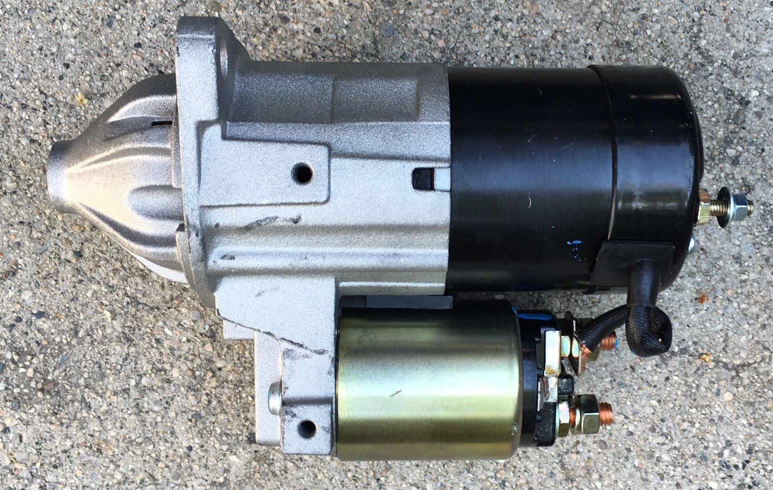 2. The new starter has the two shield-mounting studs in positions that are significantly clocked from the stock positions (which don't match the image on the vendor's website) and these prevent the starter shield from fitting. I will have to modify the shield by drilling two new holes.