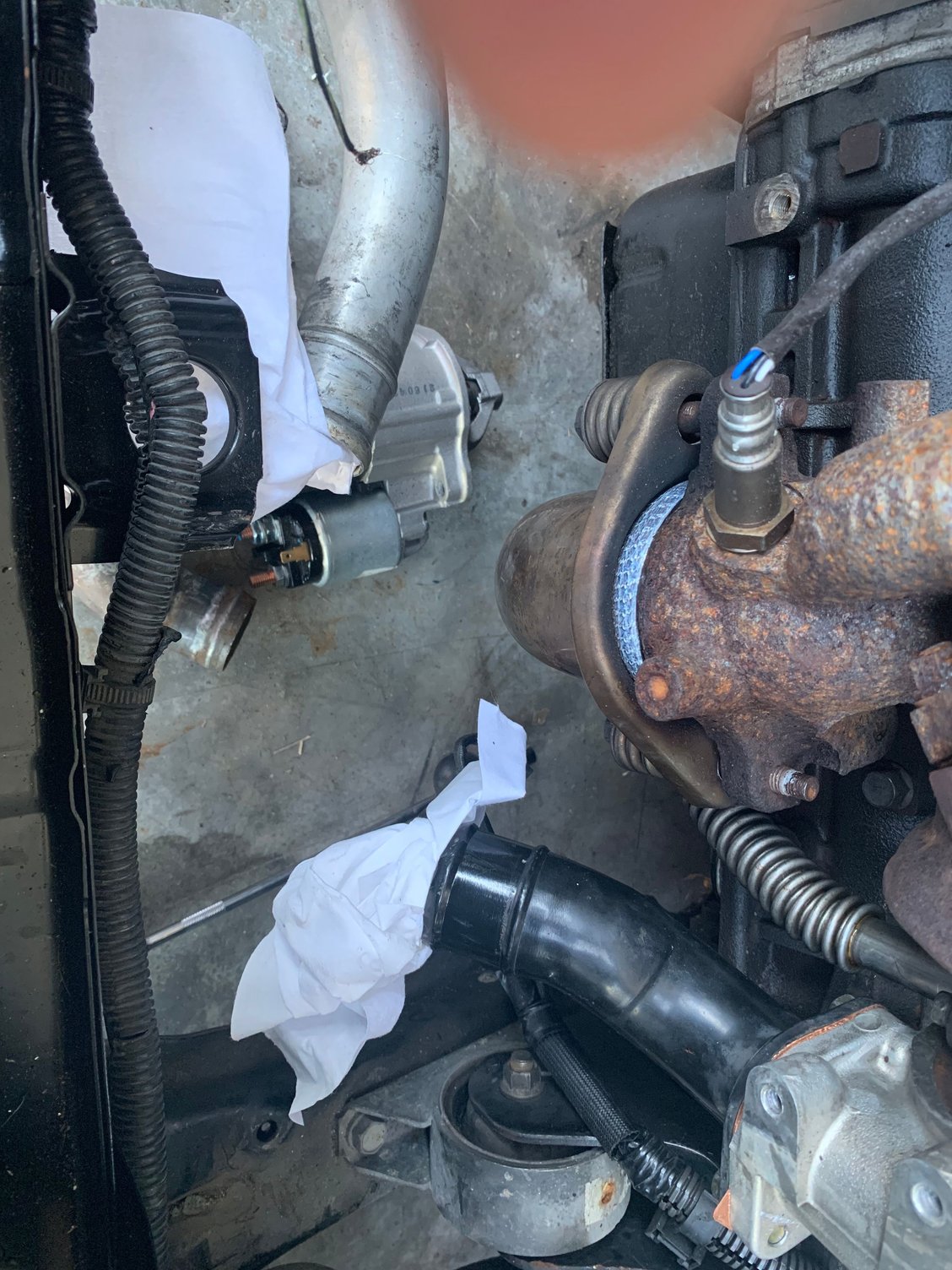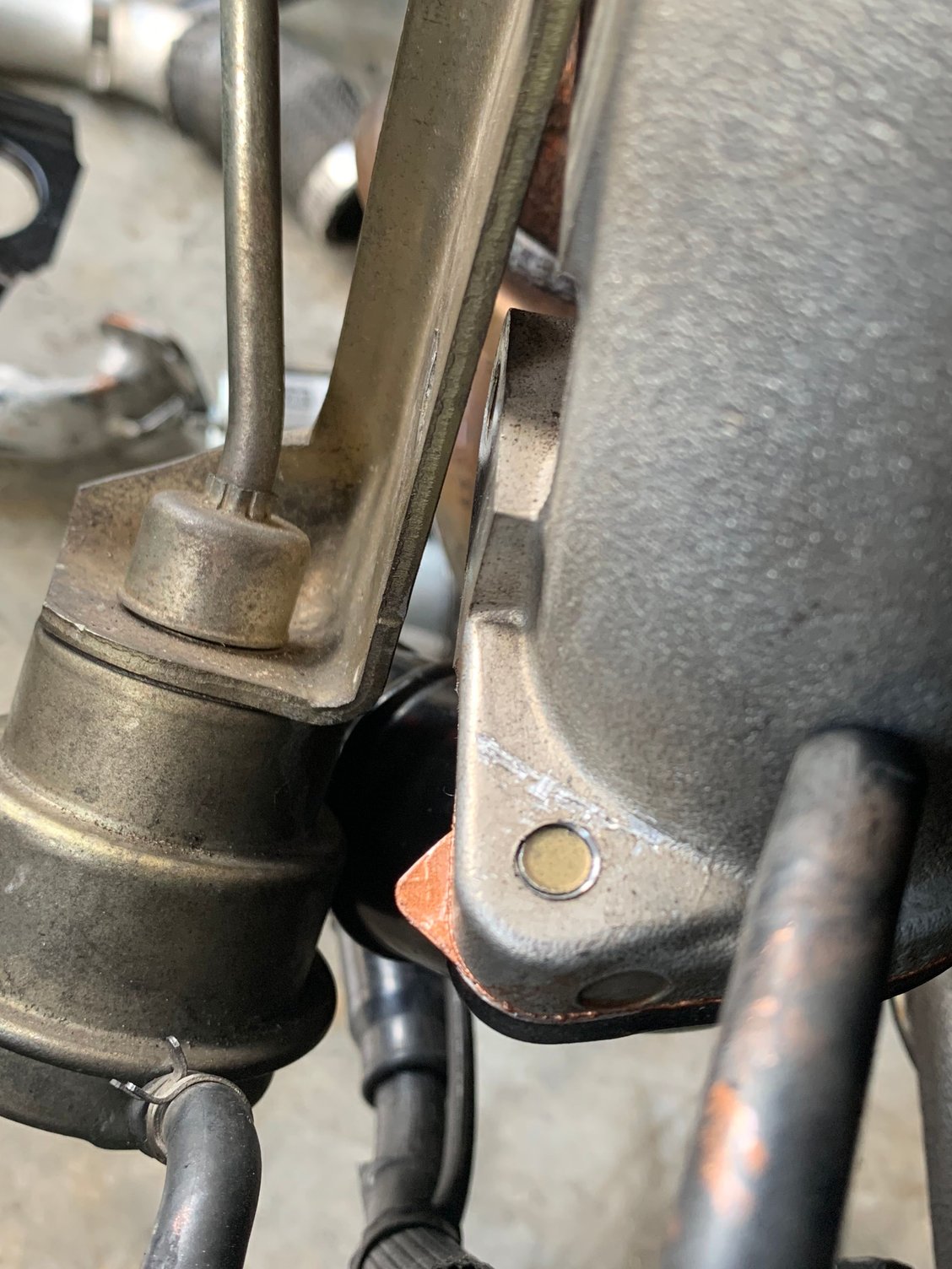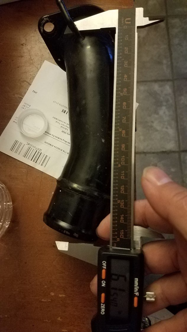 Kinda hard to do as the original one is bent and crushed, looks like original owner jacked it up from there or something. The short one next to the original. The long black one is about the same length but angles different not allowing me to mount the wastegate