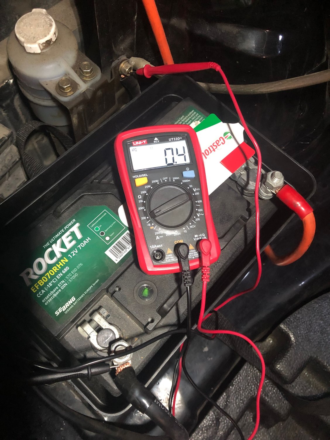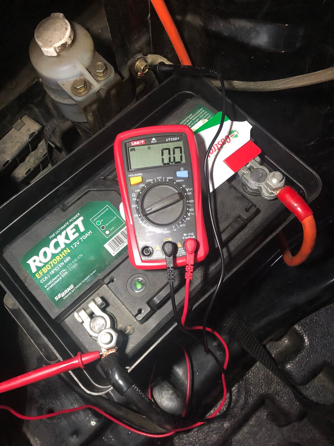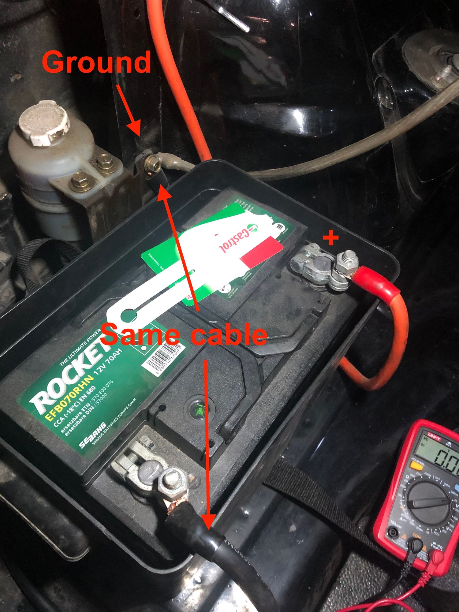 I have also tested voltage in engine bay between positive terminal (that comes from battery in trunk) and ground (showed in picture), chassis, engine and others. It all showed exactly the same voltage as the battery did: