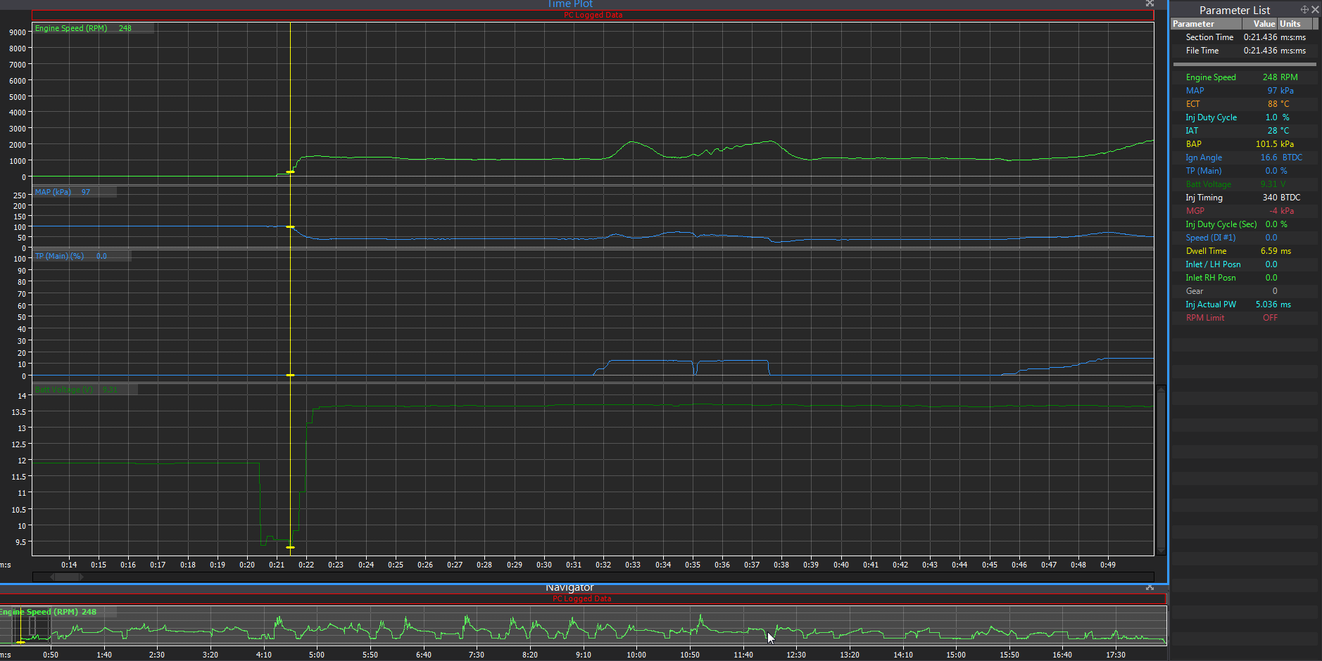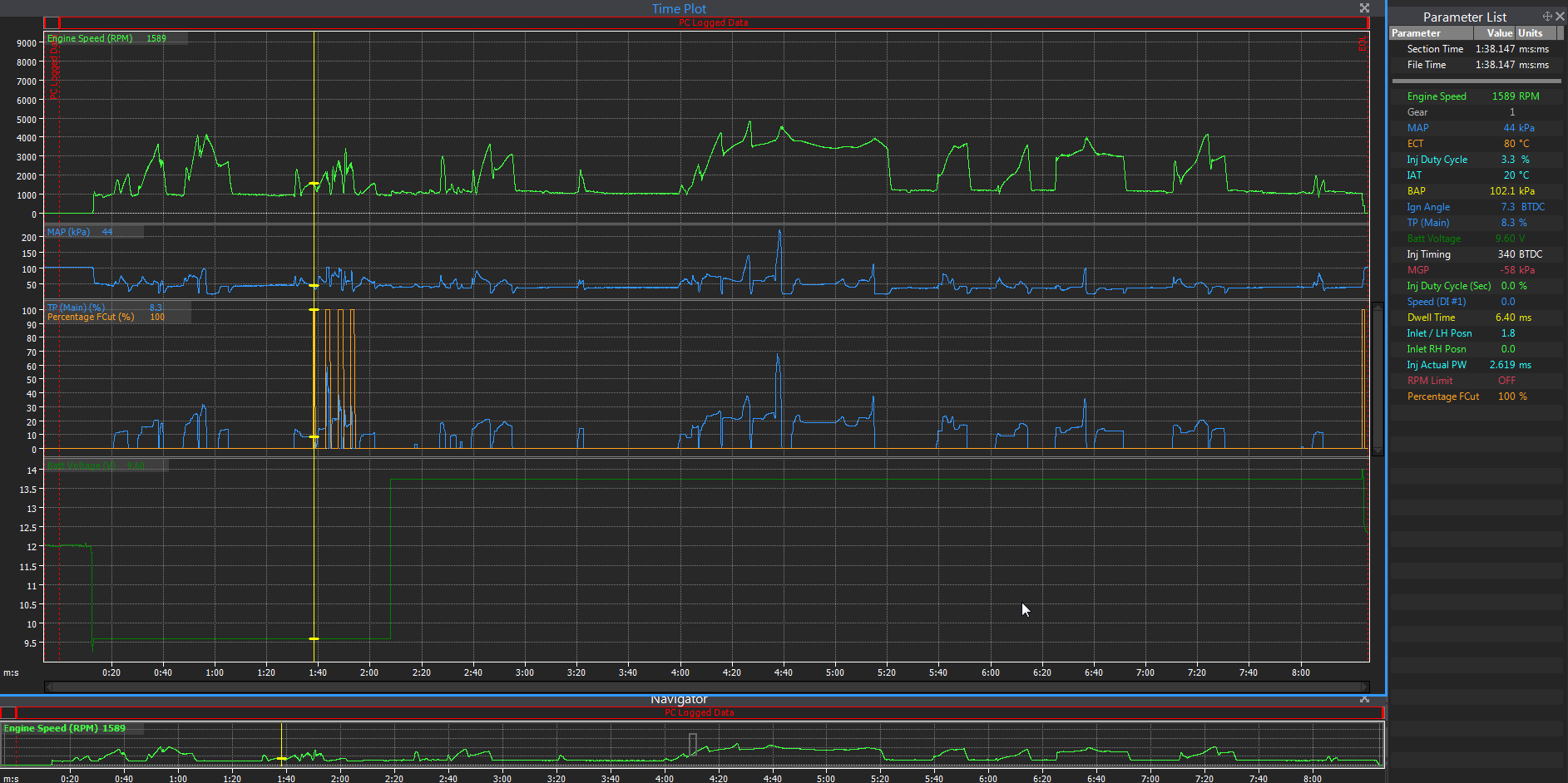 From what I can see comparing logs from ride when problem occured and one without, the difference is that my voltage doesn't rise just after cracking. Cracking voltage is always low (approx. 9V) but sometimes it 'gets up' and other time doesn't and I get my fuel cut. Am I getting it right? Here is a picture of log that I got my problem caught: