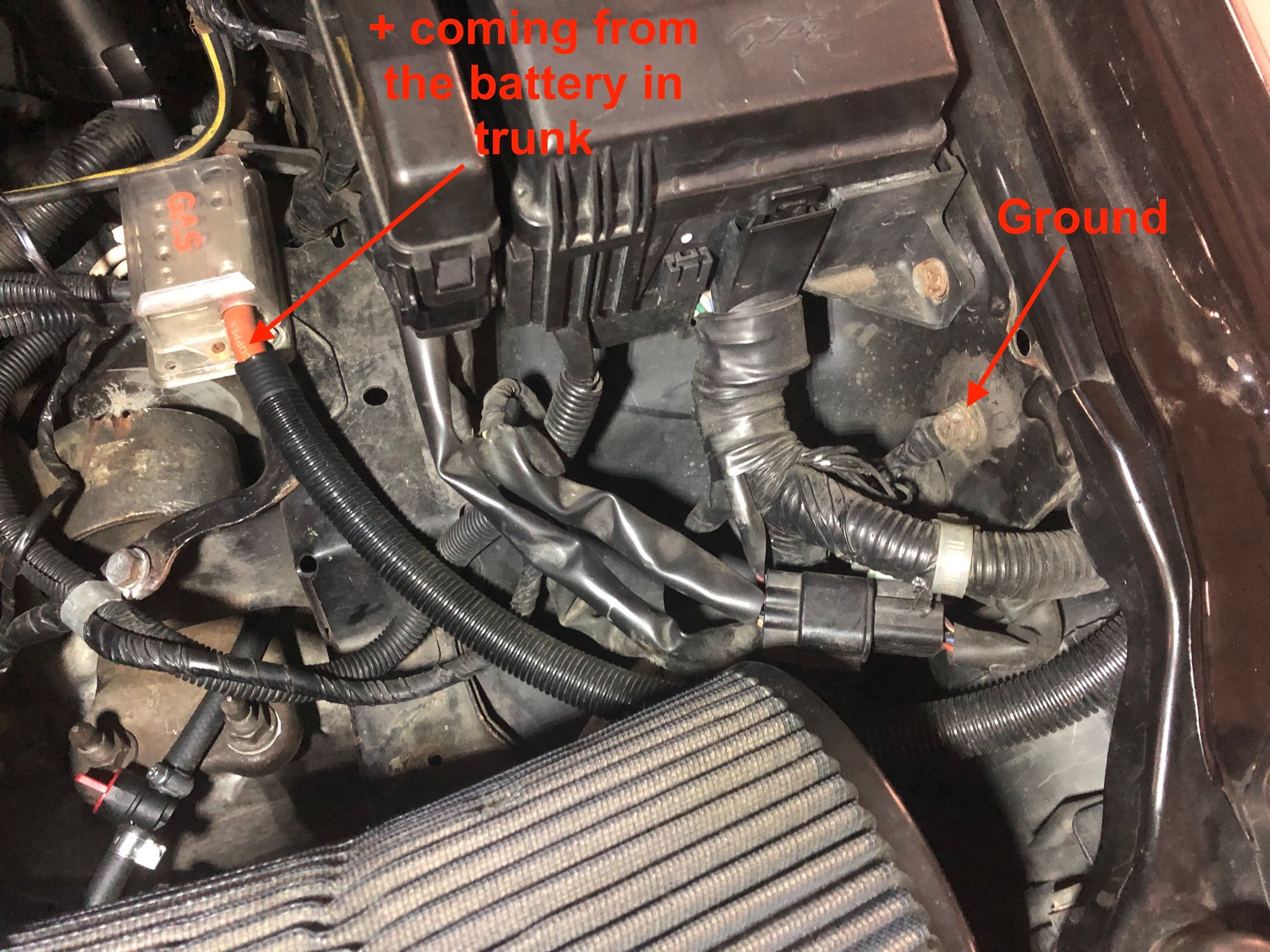 between battery ground terminal and chassis ground where the cable is pinned ("Ground" in the picture)