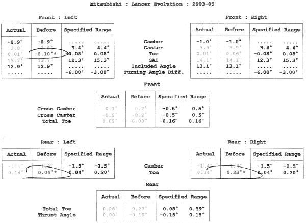Overall, a decent alignment, its an improvement in most areas and generally tightened things up. I cant see clearly on the printout due to the circling of the rear camber values but was that running positive camber before the alignment?? hope not lol!