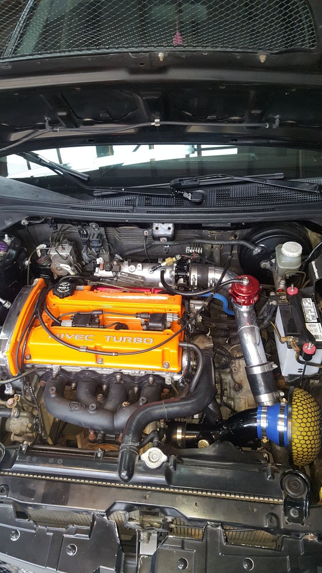 here is a current pciture of engine bay. i had the fp race manifold cermaic coated. added light weight battery. tial bov. clear timing cover so i can keep an eye on timing.