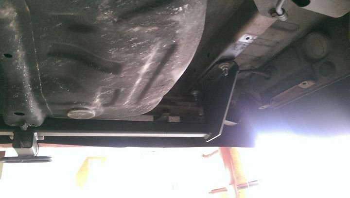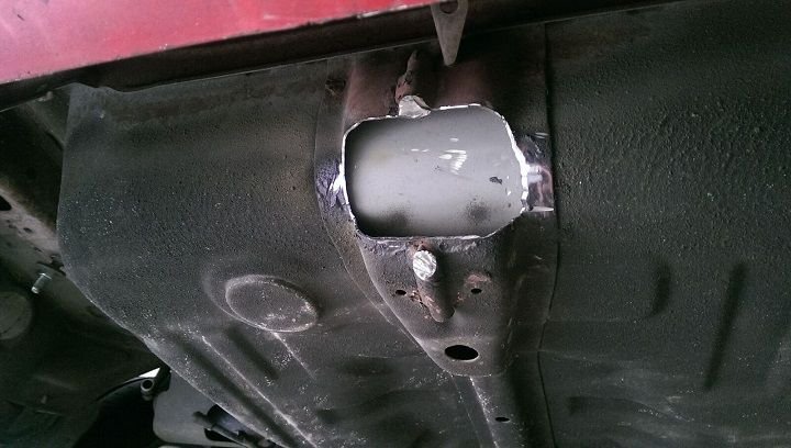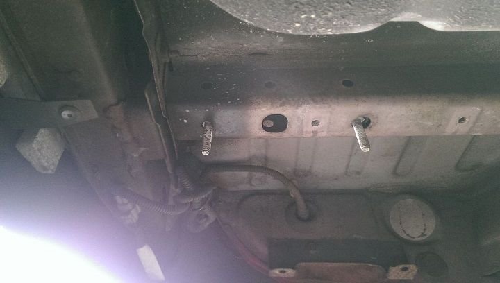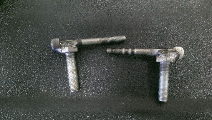 The mounting holes on the driver side are already in place, but the passenger side you need to drill one hole. You can use drop-in hitch bolts if you have a trailer shop nearby (or an old hitch laying around that used them). Drop in bolts are bolts with a metal bracket fixed under the head that you slip into the frame and the bracket prevents it from turning. Since I wanted to make this for free, I just took some old scrap bolts I had laying around and welded them to the Outlander mounting bolts (The Outlander has threaded holes in the frame; the frame rail is the same thickness on the Evo, but there are no threaded holes of course). I opt to put broad washers on the top side (on bolt first) to increase/broaden clamping distribution.