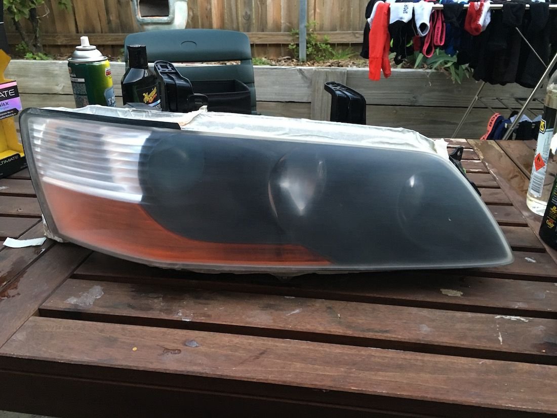 the best headlight solution is to buy a cheap battery drill motor from harbor freights, and pick up their pittsburg headlight restore kit, or a 3m one. the pittsburg has all the sand paper, and headlight polish in it. what I did was attach the sandpaper to the drill, ( it has its own mandrel), and sprayed some water while sanding the headlight. you can sand for quite a while, as it is a fine grit, to get the headlights as smooth as possible. then, apply the polish, and use the buffing pad from the kit with the drill motor. about 15 minutes later, my headlights were crystal clear. remember to get some sealant or clear, or you will be doing it once a year.