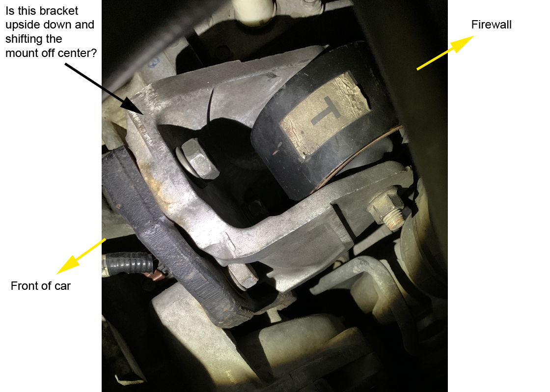 I had my clutch replaced a little over a month ago and was diagnosing a metal clinking engine noise recently and came across the rear motor mount (not under battery but next to firewall). I get the impression that this is not right. My rear mount sets at a sharp angle instead of coming off perpendicular to the bolt that connects it to the mount attached to the trans. I'm struggling to find pics online to confirm what it should look like and I'm confused as to how a shop could have installed it wrong which would cause this angle. Is this normal or should this mount look like the others and the bolt that runs through it should be perpendicular to the mount bushing....thus the arm that comes off this motor mount points straight down and not at an angle? I am wondering if the mounting bracket was installed upside down which might shift this motor mount off center. This is an 2005 - 5 speed. Anyone willing to take a pic of your rear motor mount and this bracket to confirm this for me?