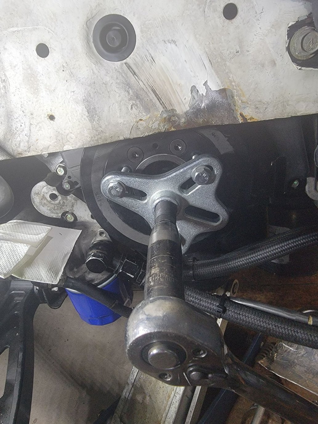 No didn't do that I just put my half inch drive with something over it and used my control arm to keep it from turning. Did you have to drop your front motor mount to get the engine low enough to not interfere with the puller? I can't find my large adjustable to put on the nut so I have to find it