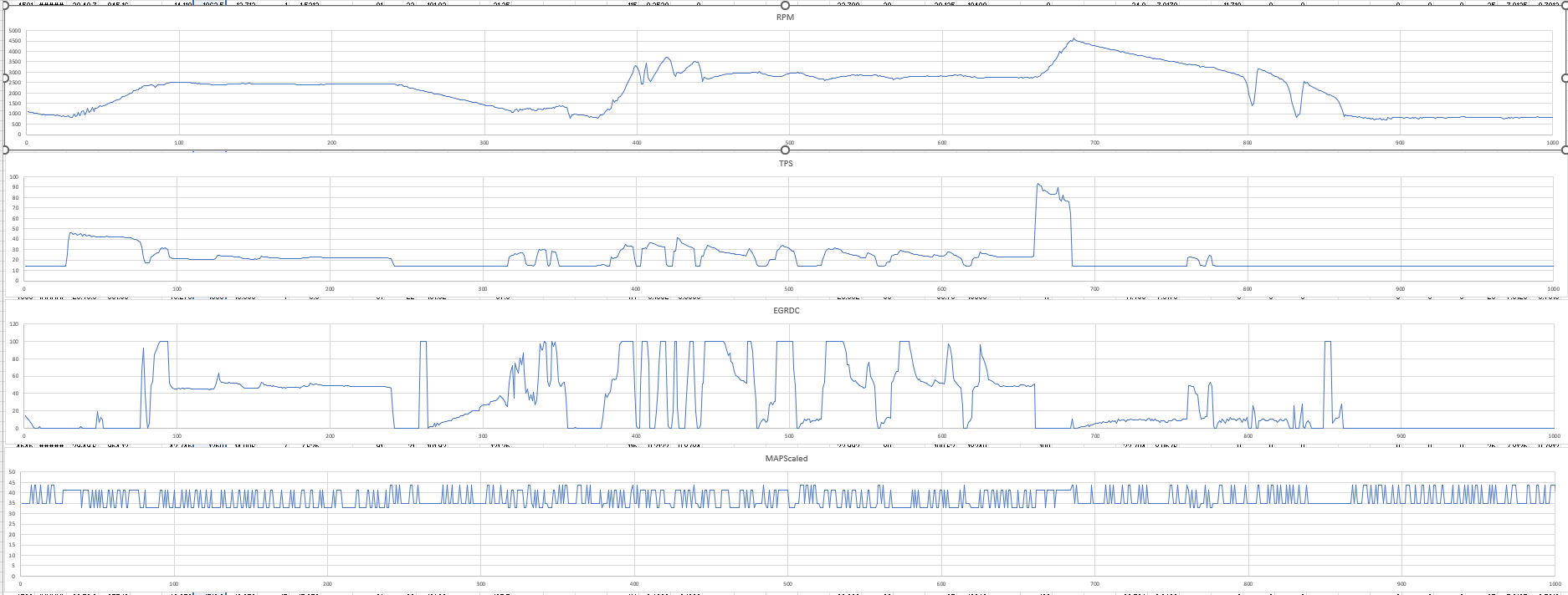 Alright, I finally was able to find time to log some data with my car. Here is a clipped log of driving following the service manual's recommendation for EGR drive cycle (hold 37 mph for 20 seconds in 4th gear then coast to idle). I'm not sure what this is supposed to look like, but looking at EGR duty cycle, I'm a little surprised by what I'm seeing. I checked with an OBD scanner prior to this drive and the CEL was pending but not illuminated. The first time I followed the drive cycle the CEL immediately came on. In the section of the log below it looks like EGR duty cycle is non-zero while I'm holding 37 mph then drops to zero when I lift before momentarily jumping to 100 and back to zero then slowly climbs. I'm guessing this may be some sort of internal test it is conducting to try and force a stuck solenoid to open or something, but I don't think this is typical operation in a working system. I also logged the "MAP scaled" channel but it appears to be set up incorrectly and produced garbage data. I'll need to look more into how I can log the factory MAP sensor's raw data.