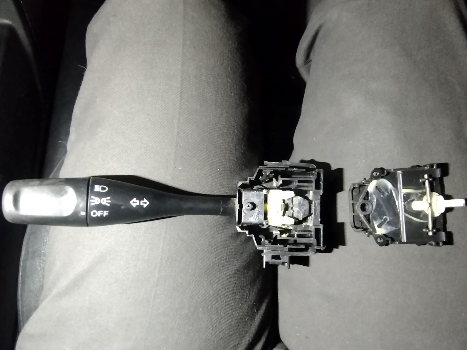 Step 11: If it doesn't work, say a curse word or two, have an adult beverage and buy a new switch. Steering wheel and airbag removed Remove two small phillip screws on switch Degrease and scrape clean these areas, then relube Enlarged view of main switch body