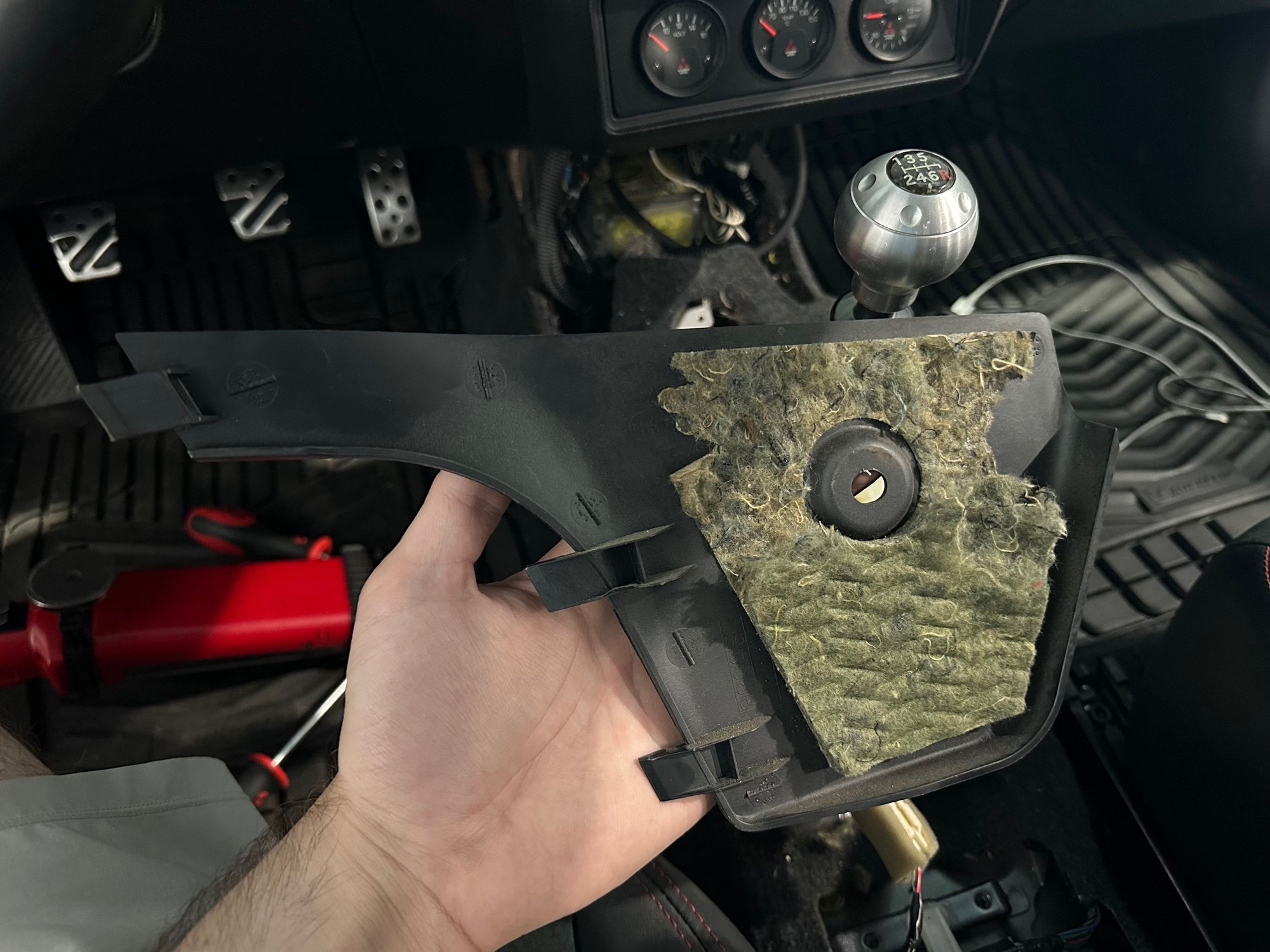 The separate trim piece in the driver's side footwell that is clipped into the shifter surround.