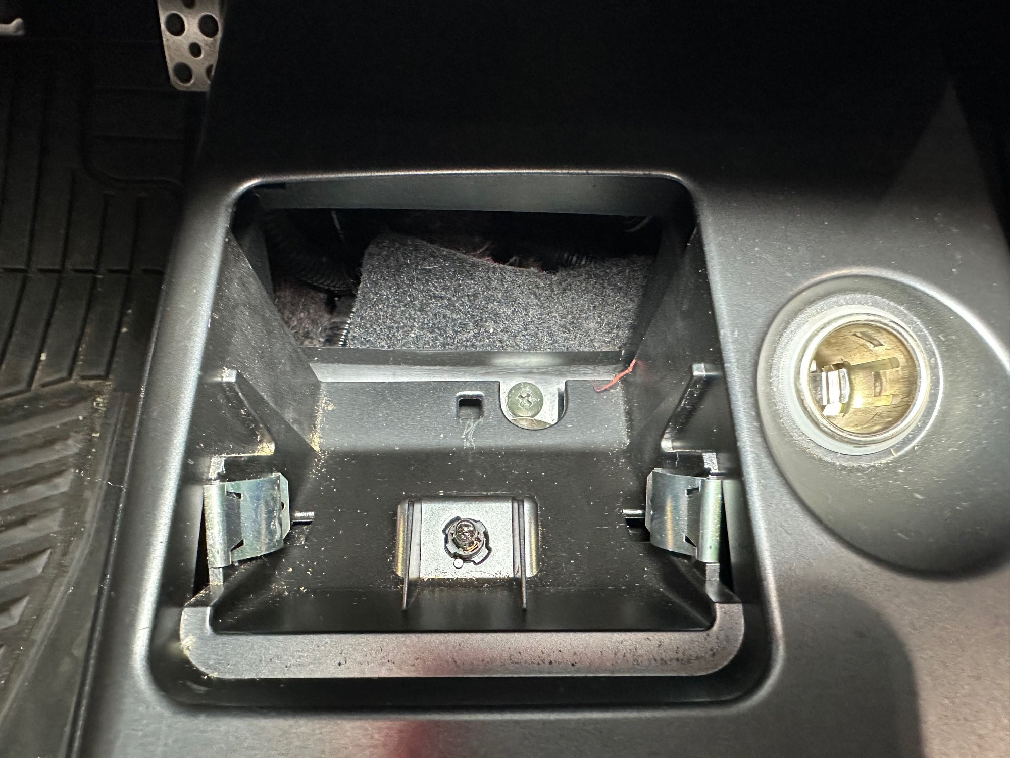 The wire that delivers power to the cigarette lighter port needs to be unplugged before the shifter surround can be fully removed.
