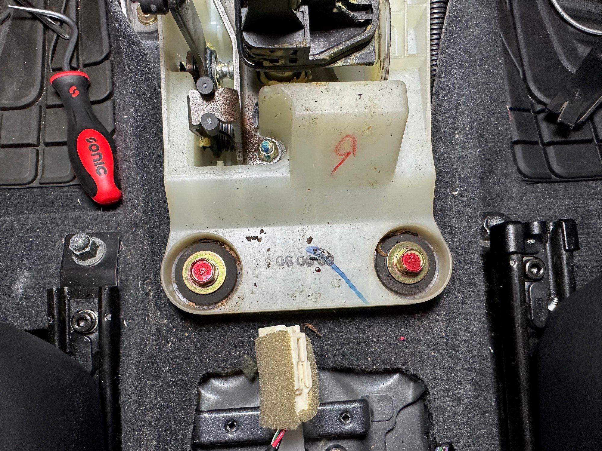 The four shifter bushings that are being replaced are now accessible.