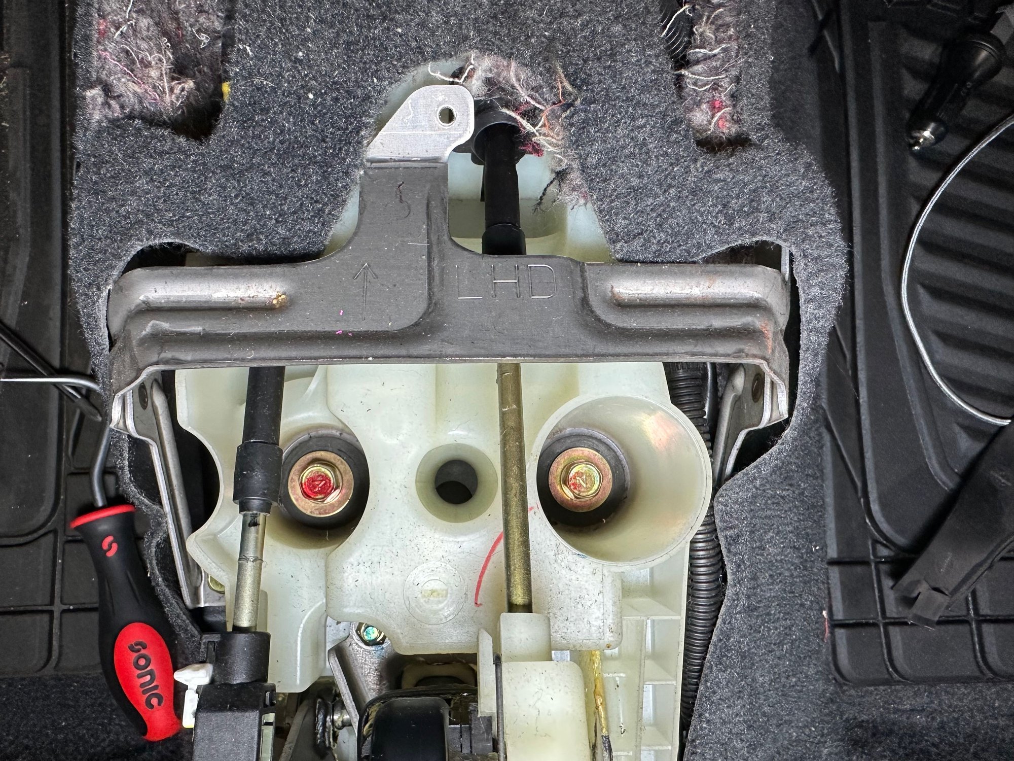 Each shifter bushing is secured by a bolt. Access to the far left bolt is partially blocked by one of the shifter cables. To get around this, remove the other three bolts first, which allows the shifter base to move around. The shifter base can then be shifted so that a socket can clear the shifter cable to remove the bolt.
