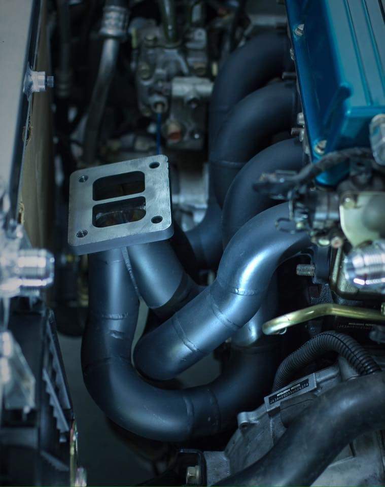 I ended up with a as-equal-length-as-possible 1.5" 321 stainless manifold and a 3" titanium exhaust pipe that exits through the hood. The intake and LICP are aluminum coated in wrinkle black powder coat.