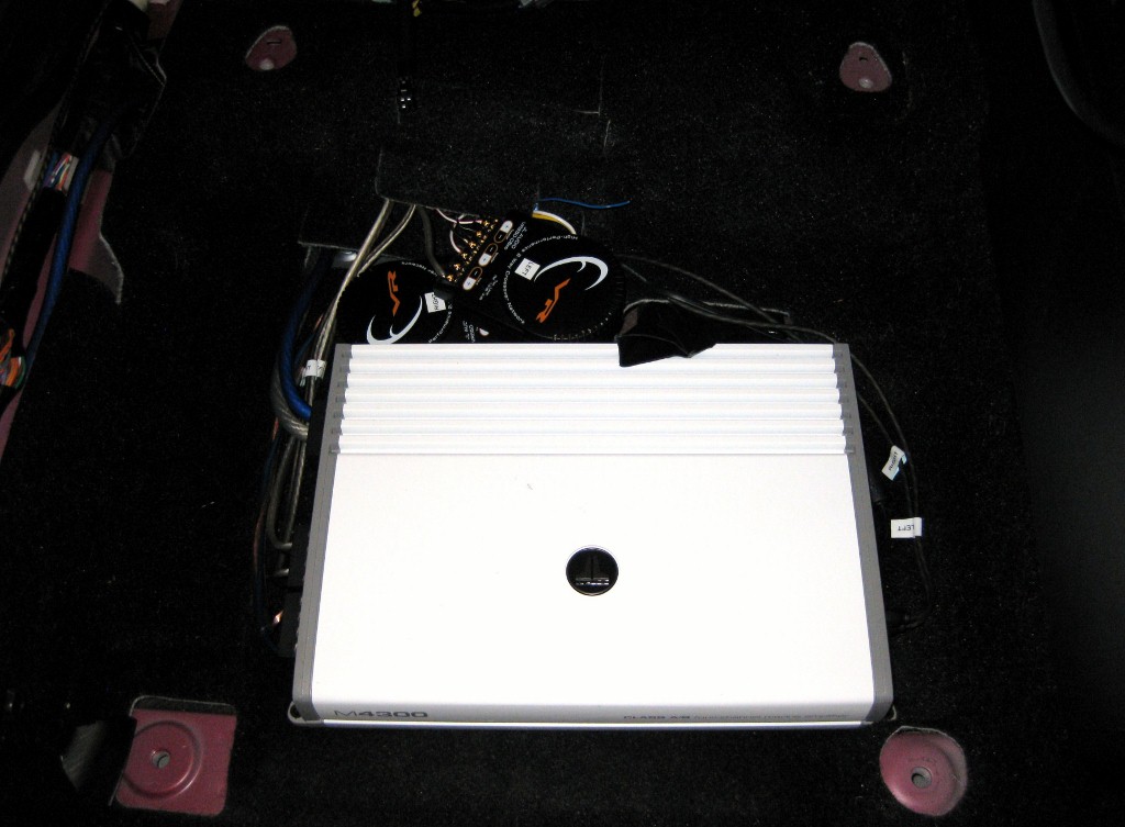 I got the new amp 100% hooked up, with the new JL crossovers. Even though I haven't changed the speakers, holy hell do they ever sound fabulous! And the gain on the amp is all the way down! The M4300 fits PERFECTLY under the seat with a little bit of a modification to the heater vent. Other people cut it off completely, but I modified it so it blows over the amp, rather than directly into it.