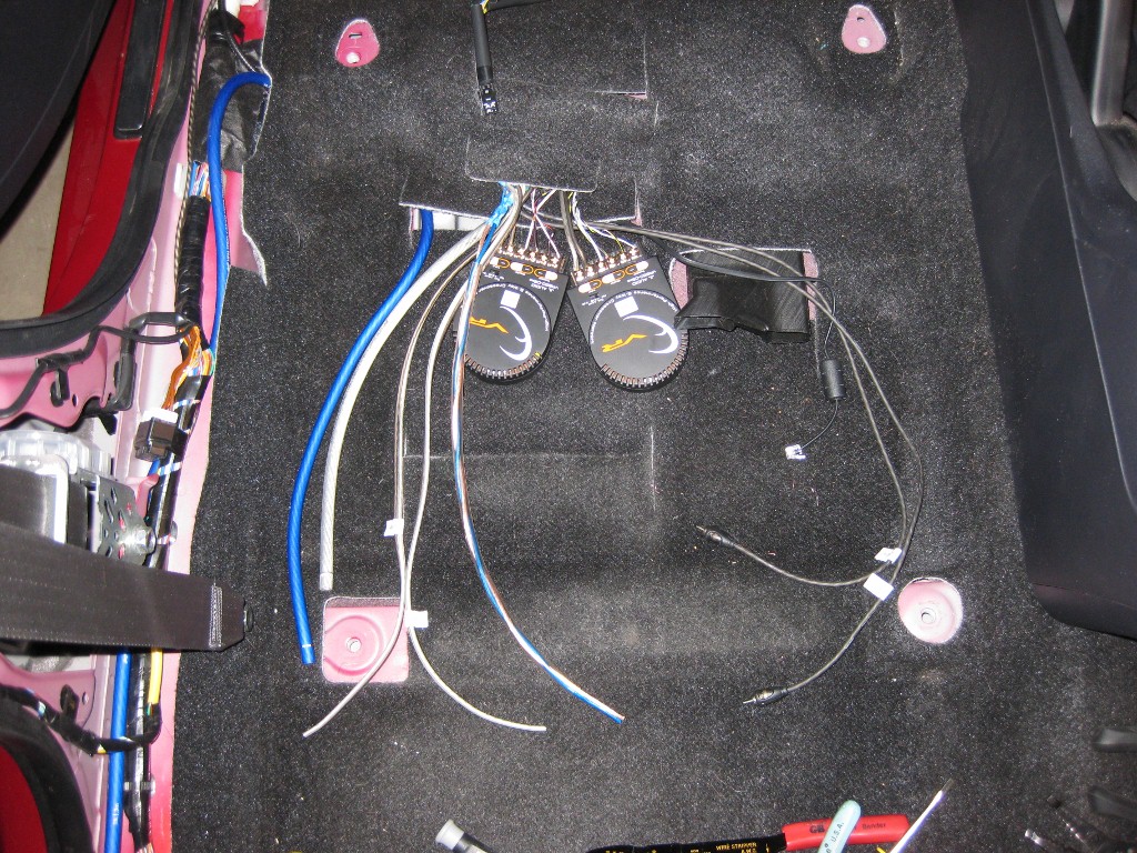 Here's all the new wiring in place for the new amp, with the new crossovers for the front speakers.