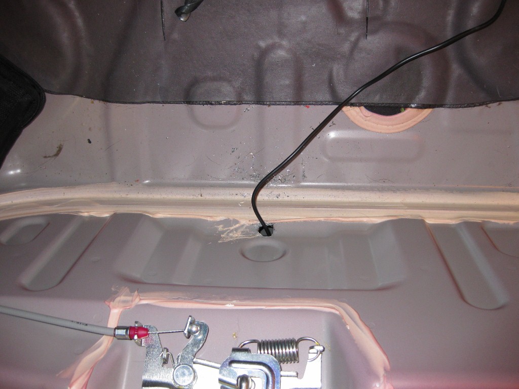 This is the inside of the trunk where I ran the backup camera wire. If you drill in this EXACT location, it meets up with a hole behind it that comes out right above the license plate. It's tricky to get it through there, but it worked! I will fill this with some silicone tonight.