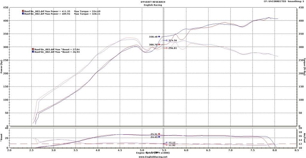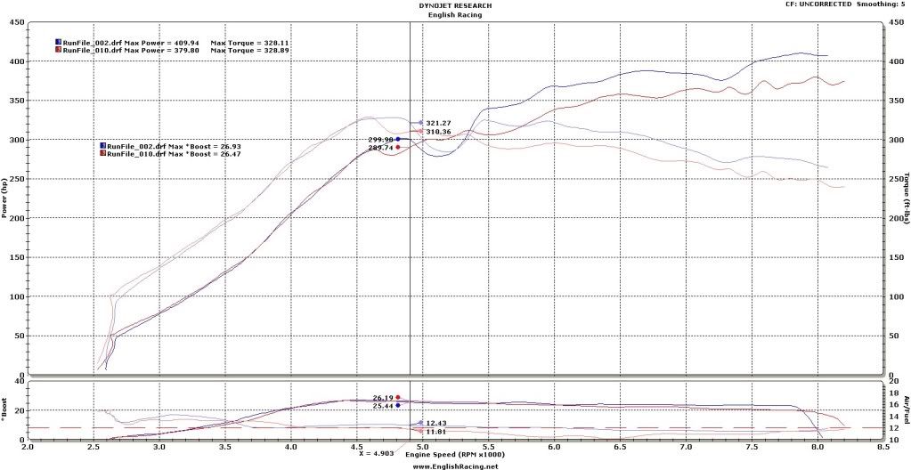 Please have a look at these dyno graphs. Both 2010 MRs, one has the SSP shift kit/seal kit and no torque table mods other than the airflow CEL and ASC stuff (that is the 397whp) equipped with a Green and meth. The other is a pumpgas Black. Both have the same Kelford B cams. The FP black car has every table mod done that I can find. The one thing that links them is that they both drop timing at 26.9psi and 328 ft lbs. What am I not seeing? The .zip has the latest logs from the Black car that are pertinent to the issue. At 5200 rpm it goes from 10* to 4* independent of the map.