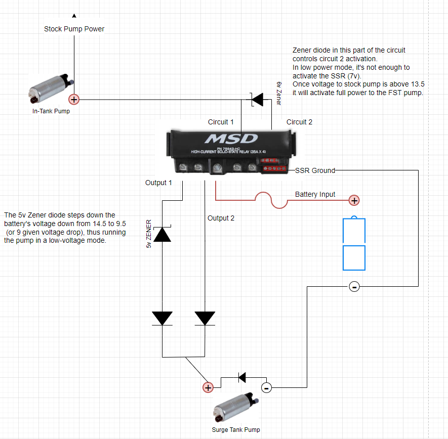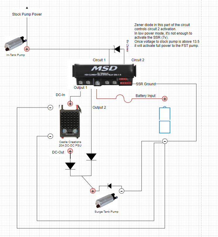 How likely is for this design to work, or not work? I imagine the Zener diode down-stepping the voltage supplied by the battery is the big point of failure, where if anything goes wrong, the fuel pump gets cut off from power if the car is below the high-power load. In my case, the lift pump is a Walbro 255, and the surge pump is a 450 - so I think the 35A limit is just fine for my uses. The car only makes around 400 and I don't have plans to go further.