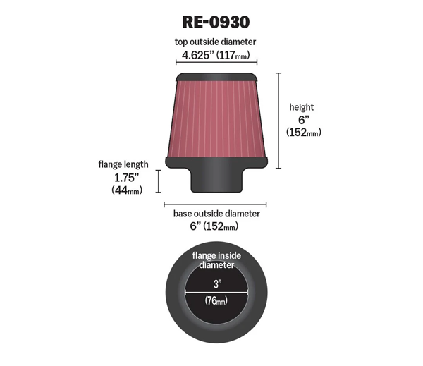 The oiled filter RE-0930 has a flange inside diameter (FID) of 3", base outside diameter (BOD) of 6", and height (H) of 6". The AEM's "'really big 3" FID'" filter I found is 21-203D-XK (FID=3", BOD=6", H=5.563"), which will likely fit and it's big enough for our Evo X. With a pre-filter wrap, the cleaning and replacement interval will be comfortably long. If I end up with this setup myself in the future, I should post on the forum whether it works well.