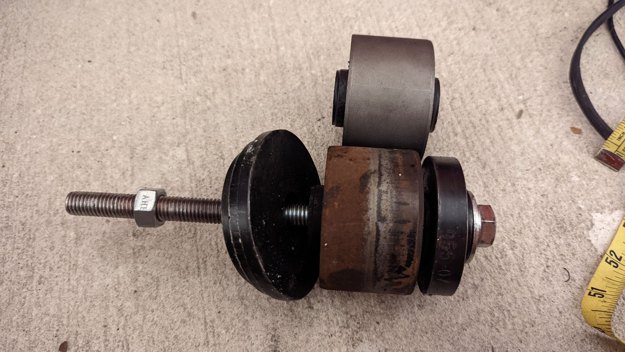 Note: I also used a sleeve that went along with the bigger piece on the left that allowed space for the bushing to press out. Did this opposite to install new Ralliart Group N bushing.