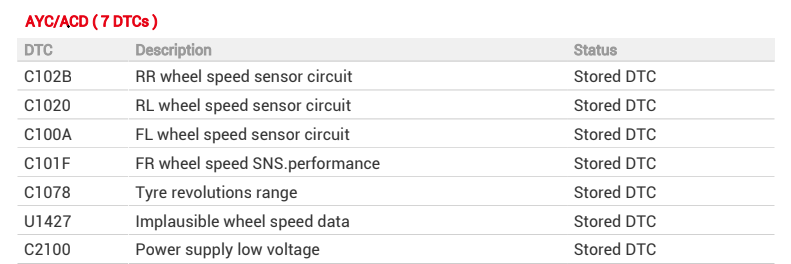 Edit: Codes will not appear when the car is sitting idle, but only come on after the car moves. ABS light comes on first then the AYC/ACD light behind it and my 4WD right after that.