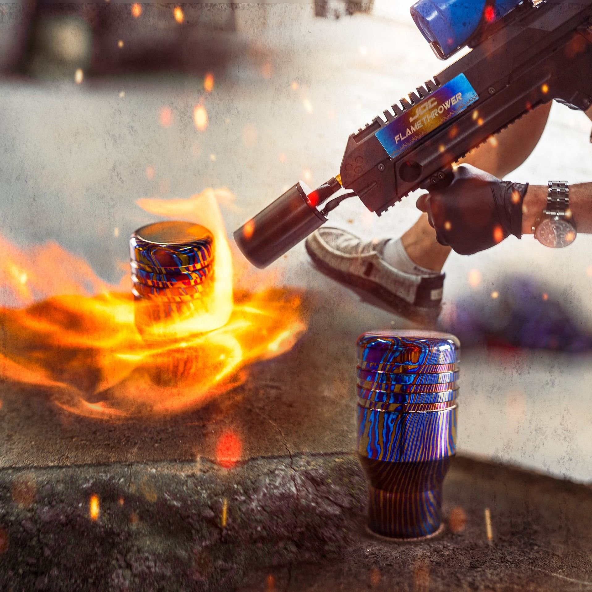 JDC Timascus Piston-Type Shift Knob. Small batch production, torch colored with an actual flame thrower. Multiple laser-etched shift patterns are available, as well as custom options. Available in M10x1.25mm, M10x1.5mm, M12x1.25mm, & M12x1.5mm.