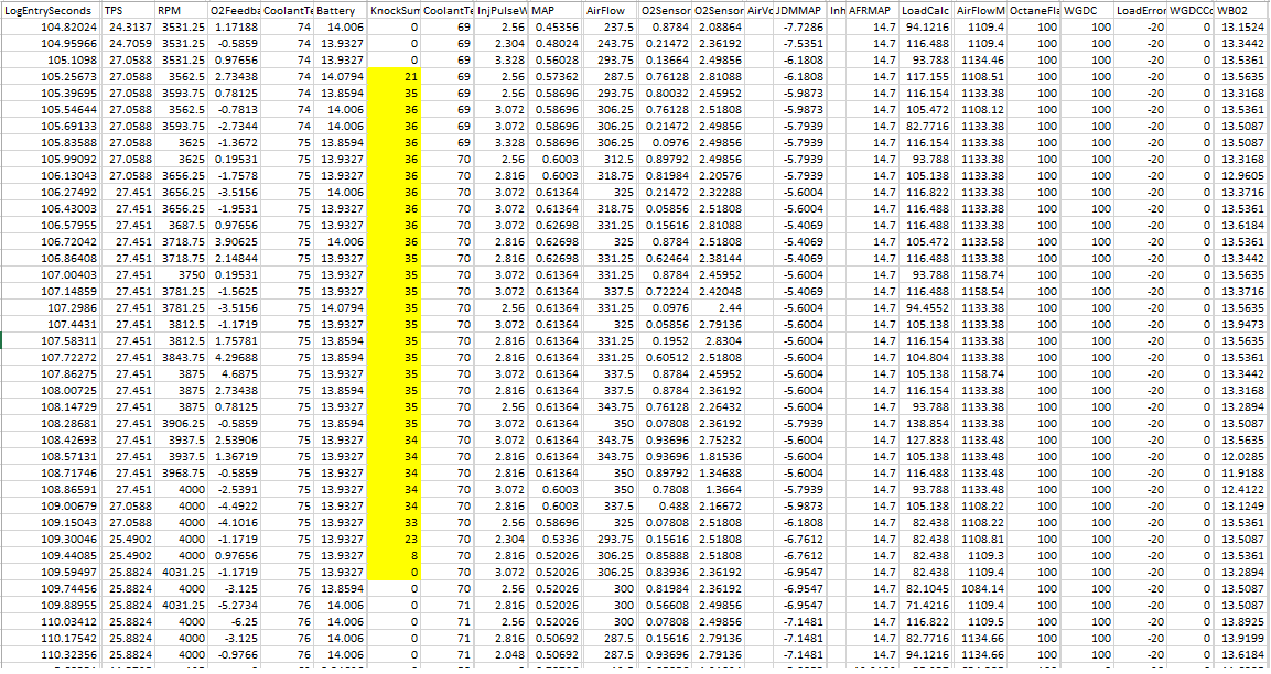 Despite all this, it looks like the car had issues before it hit the dyno. I say this because you don't just get 30 counts of knock during cruise unless there are other issues.