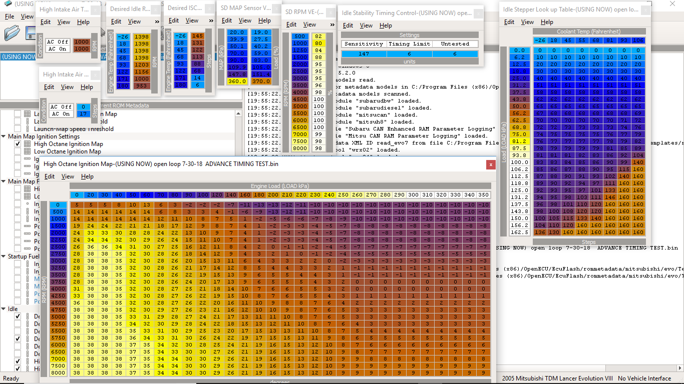Ok, im starting nother thread because this issue is going to drive me nuts. Car is an 04 evo 8 with evo 9 turbo, s2 cams, and full bolt ons. Im running open loop because i cant figure out the lean tip in issue in closed loop. Trust me ive tried everything. Im trying to get the car idling steady as possible and keep that lumpy idle. Problem is afrs hunt all over the place some times from 13s to high 15s. Does the same in closed loop. I adjusted the biss via sas evoscan. Ive tried all the tables. Hopefully someone has an idea on what i can try.