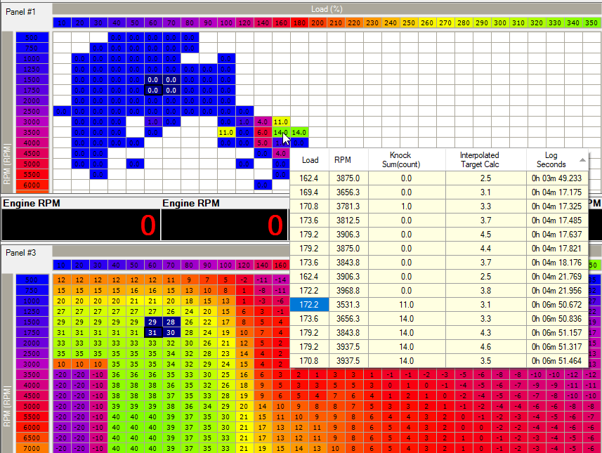 The car starts knocking as soon as it hits the 3k-4k range under boost and in the 120 load category. There are times when you can get it to knock under 100 load by playing with the gas pedal. The knock pulls timing significantly which seems to prevent the car from getting over the 8psi boost mark. I have been pulling timing with no change, the last timing pull ended with more knock in lower load.