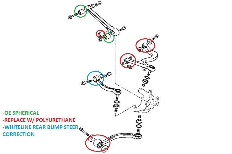 1) Do not do the full whiteline bushing kit. Only a couple of the bushings are actually an improvement and some hurt performance with binding. Rear trailing arm, Rear upper control arm, Rear lower control arm shock bushing, front control arm inner forward. All the other bushings from the factory are spherical and need to be that way because the nature of how an evo suspension articulates.