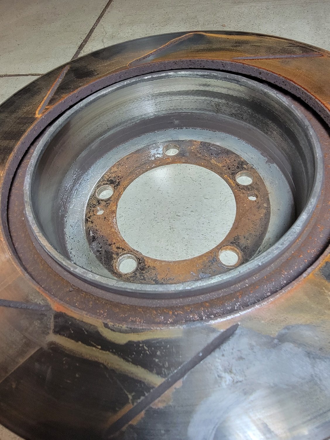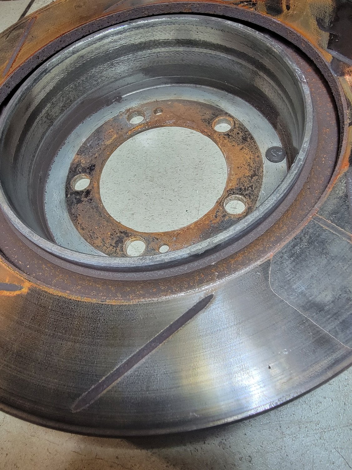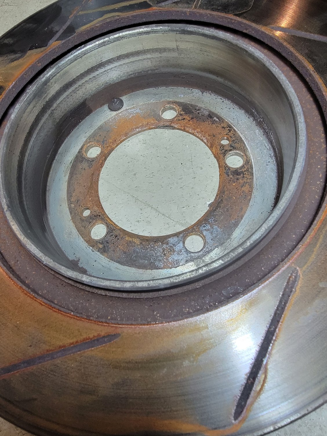 This might sound crazy, i apologize in advance. both IS axles are fine, lsd oil is light gray, not much shavings and no prizes coming out. Initially i was disappointed and confused. I was packing up for the night putting back the hub and rotor and test spun it a few times then it snagged super tight... the drum brake was engaging. I dont know if the simple explanation is that my rotor is warped, or if this 'burnt' part has too much friction or something is screwed up (more on this) or all of it. The clank/thud likely came from the lsd, like when making tight turns. this is the first time it made that sound going straight since one wheel is braking.